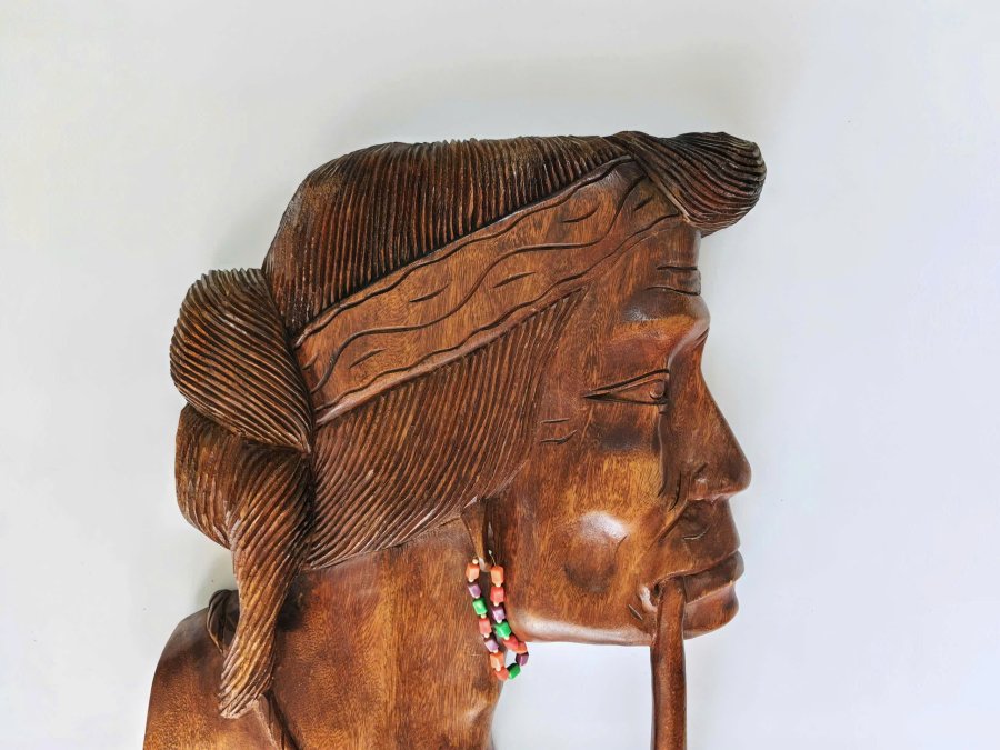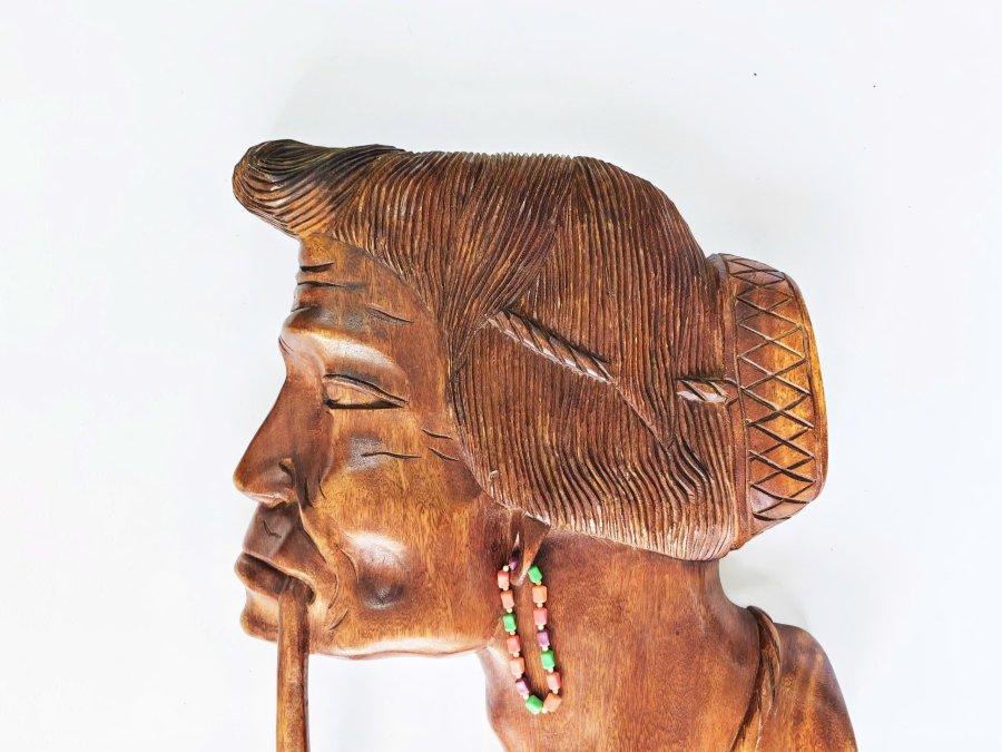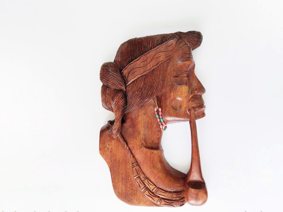 Cặp tượng gỗ đầu người hút tẩu là sự kết hợp hài hòa giữa nghệ thuật dân gian và kỹ thuật chạm khắc tinh xảo. Với hình ảnh hai nhân vật đối diện nhau, mỗi người đều mang nét mặt truyền thống, đeo khuyên tai hạt màu và hút tẩu dài, sản phẩm không chỉ mang tính thẩm mỹ mà còn gợi lên chiều sâu văn hóa và câu chuyện.