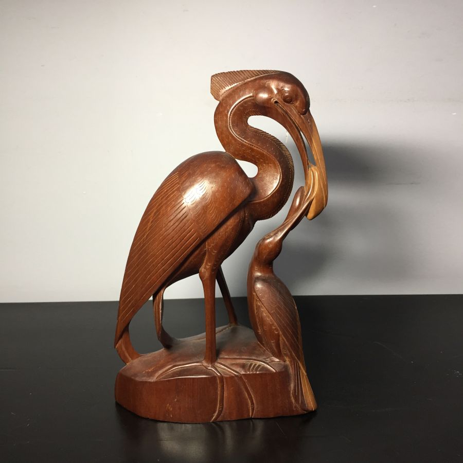Giao lưu bức tượng gỗ Đông Dương mô tả cò mẹ cho cò con ăn, tình trạng hoàn hảo, cao 30cm, có tem xuất khẩu thời Pháp thuộc, không rõ loại gỗ. Giá: 4.200k