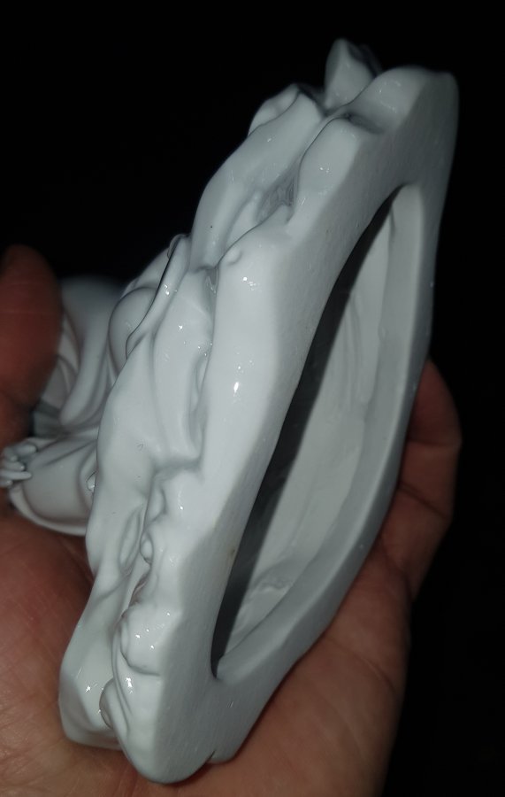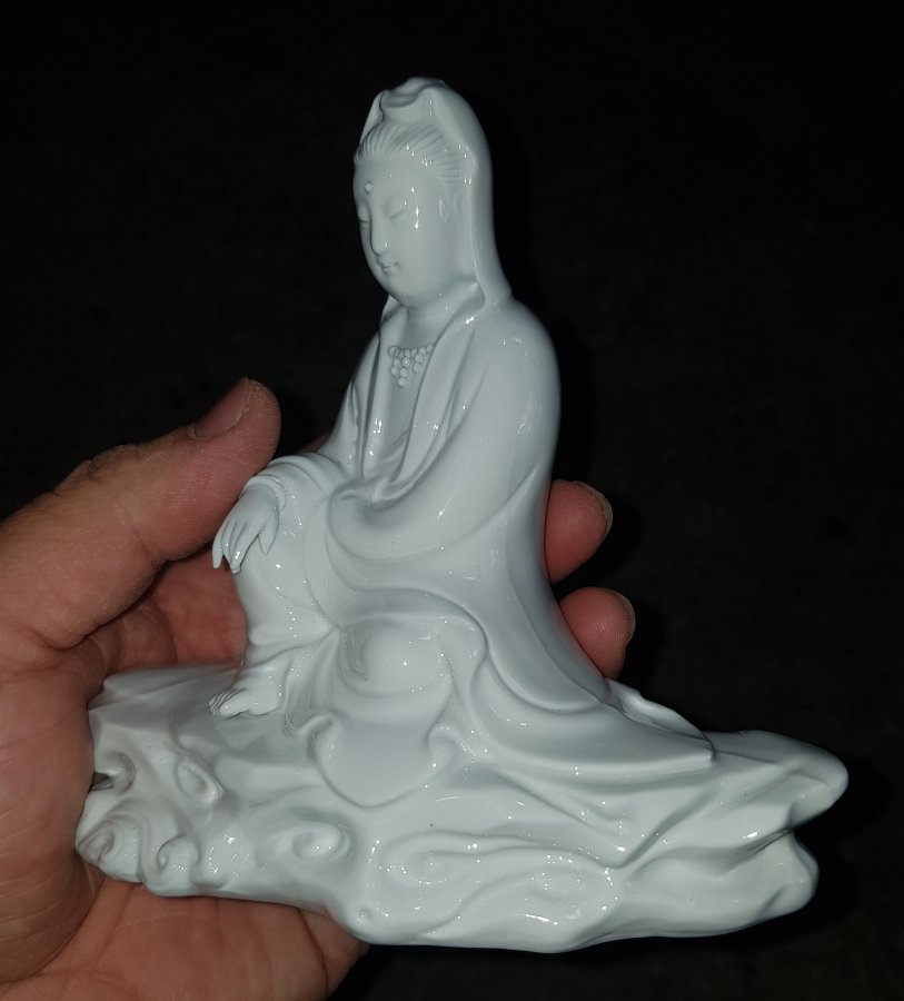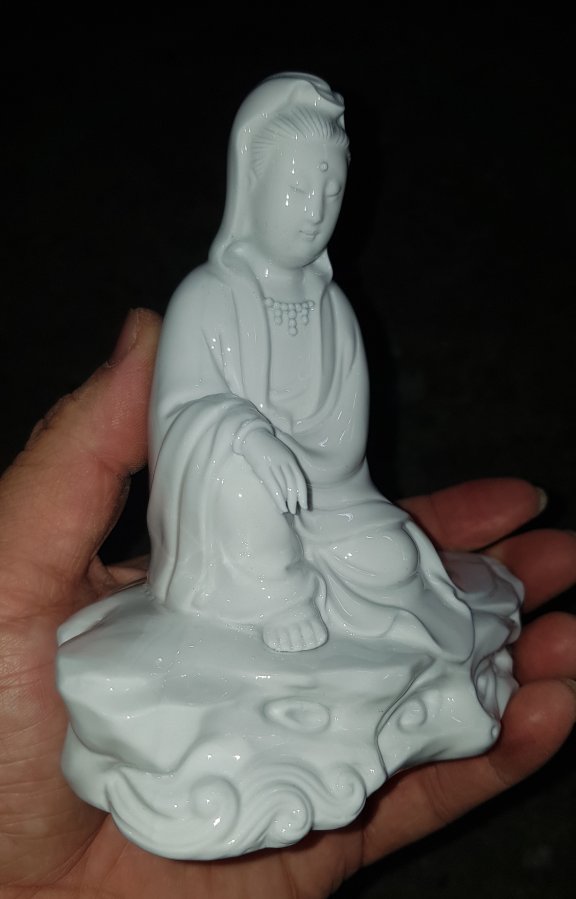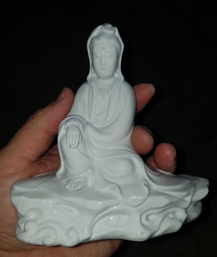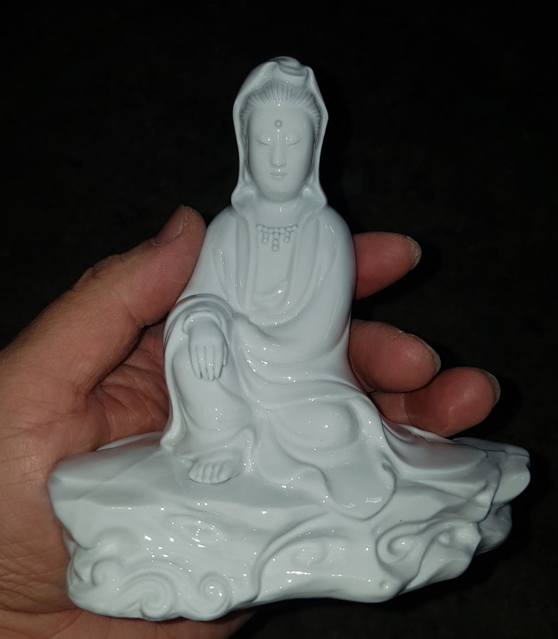 Tượng Quan Âm tọa Thạch Vân bạch định sứ với chiều cao chỉ 13.5cm. phần Thạch Vân kích thước 13.5cmx7.5cm. Lành lặn và nhân diện rất từ bi. Hữu duyên 1250k