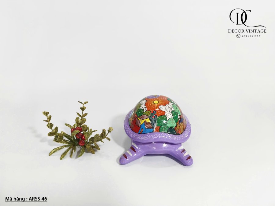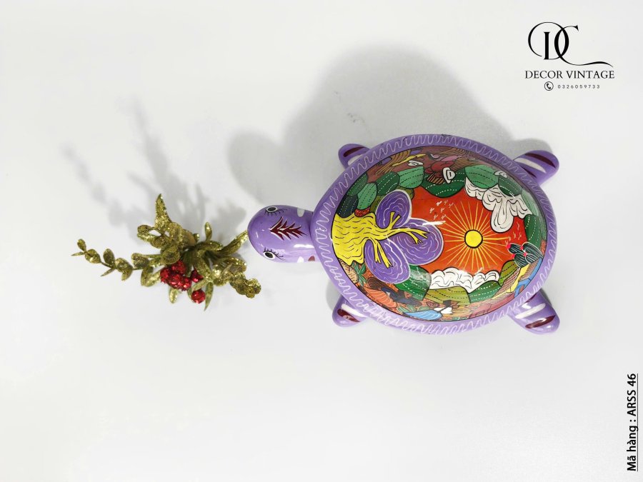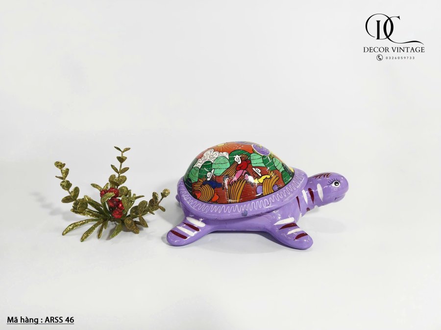 Tượng rùa được chế tác thủ công từ gốm sứ, nổi bật với màu tím sinh động và phần mai được vẽ tay bằng những họa tiết dân gian Mexico rực rỡ, mang đậm bản sắc văn hóa Trung Mỹ. Mỗi chi tiết đều được chăm chút kỹ lưỡng, thể hiện sự tinh xảo và độc đáo của nghệ nhân bản địa. Phù hợp làm vật trang trí, quà lưu niệm hoặc điểm nhấn nghệ thuật trong không gian sống.