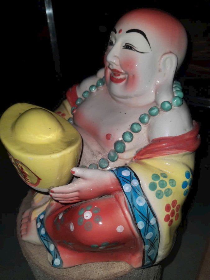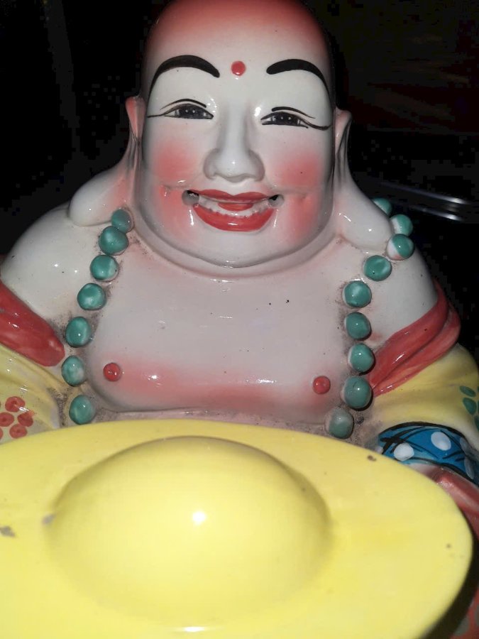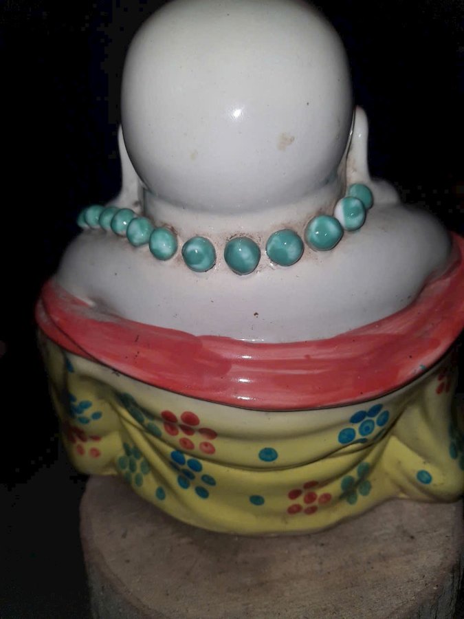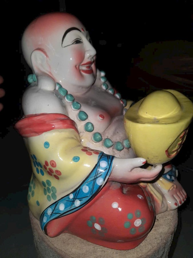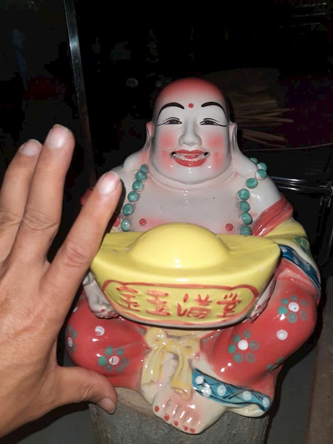 Tượng sứ tầu mầu di lặc dâng vàng, khoảng năm 2000, cao 22cm. lành đẹp.