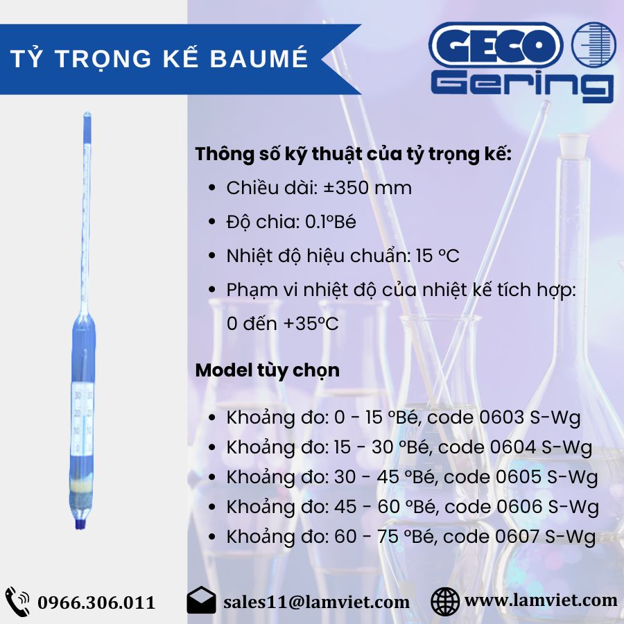Tỷ trọng kế Baumé của Geco Gering là một thiết bị chuyên dụng được thiết kế để đo lường tỷ trọng của chất lỏng theo thang đo Baumé. Đây là công cụ lý tưởng cho các ứng dụng trong công nghiệp và phòng thí nghiệm, đặc biệt trong các lĩnh vực yêu cầu độ chính xác cao như hóa chất, thực phẩm, và dược phẩm.
