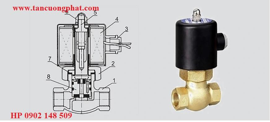 Trên thân van có kí hiệu mũi tên đó là cổng vào, phần màu đen trên đầu là coil điện từ mọi hoạt động của chiếc van đều được điều khiển bằng cuộn coil này, chức năng của chiếc van này là khi cấp điện vào thì van sẽ mở cho lưu chất đi qua, ngưng cấp điện thì van sẽ đóng, van có các loại điện áp DC24V, AC110V, AC220V…, dùng để đóng mở nước, hơi, đầu, gas…