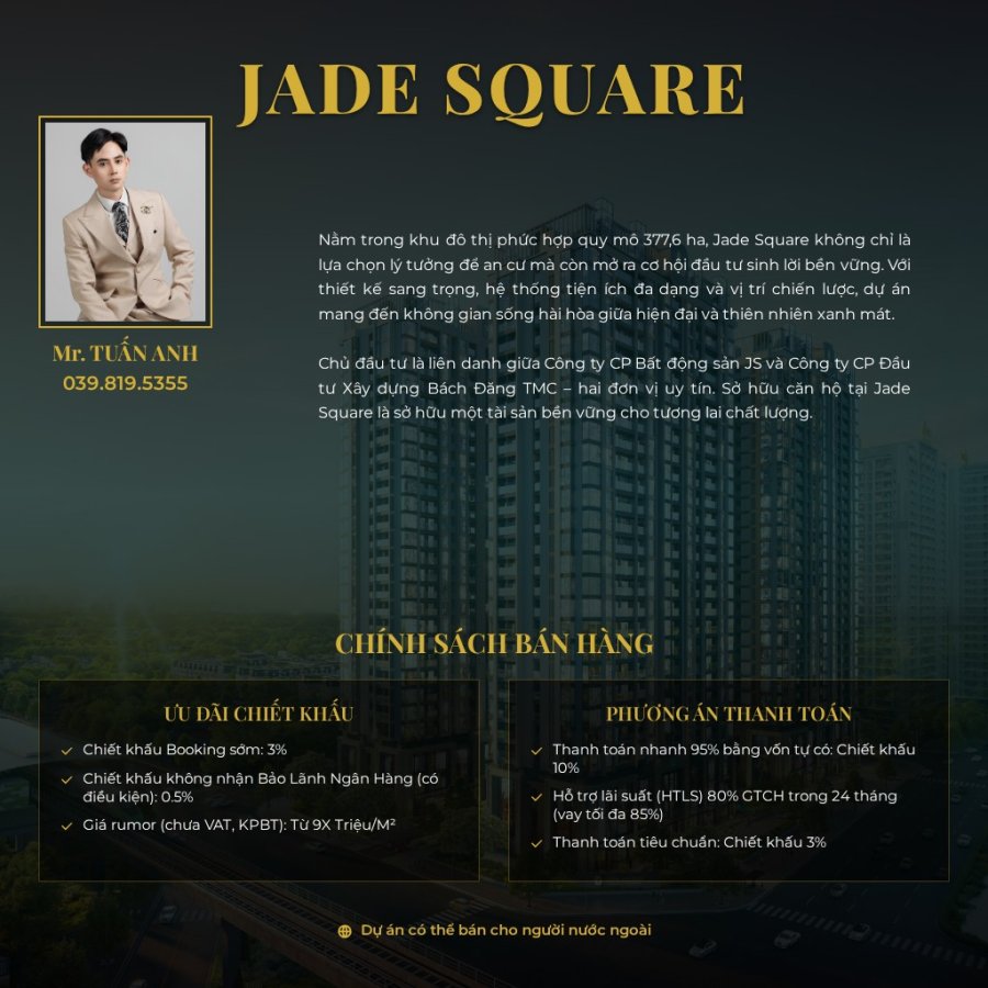 Với vị trí chiến lược, thiết kế hiện đại, tiện ích toàn diện, tiềm năng tăng giá rõ rệt cùng uy tín chủ đầu tư, Jade Square hội tụ đầy đủ yếu tố của một dự án bất động sản đáng đầu tư nhất năm 2025.