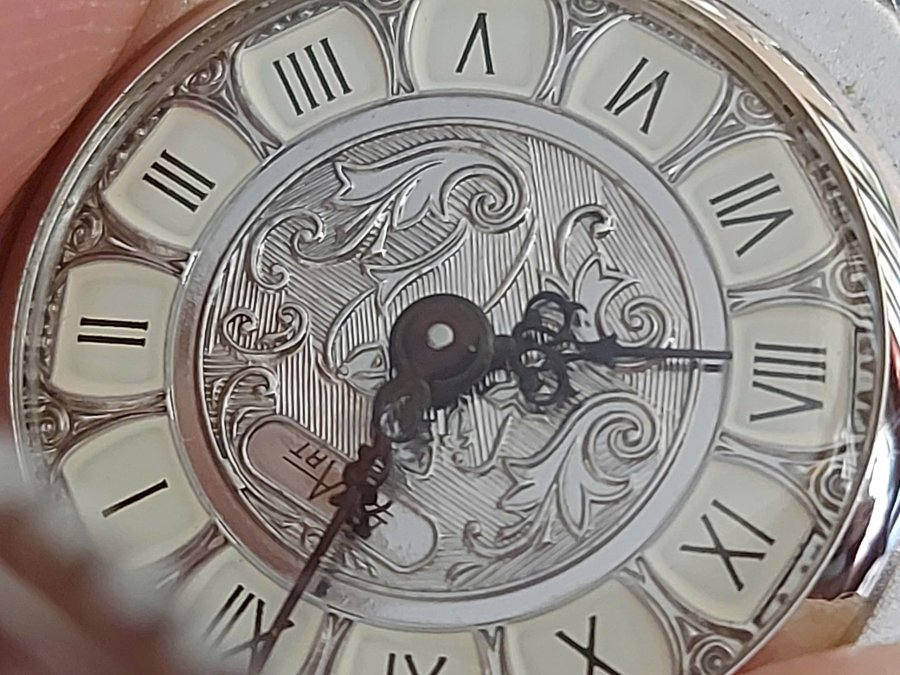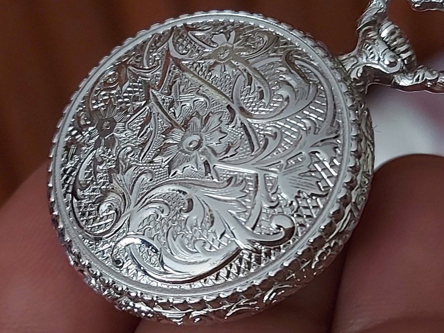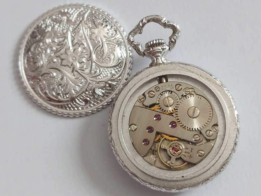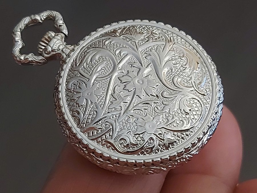 Hàng Nos. Quýt mini size 28 bọc vàng trắng khắc hoạ tiết trong và ngoài đẹp xuất sắc. Máy cót tay 17 Jewel Swiss Made. Sưu tầm rất đẹp. Giá 1 tr ! Cảm ơn. LH 0906830026