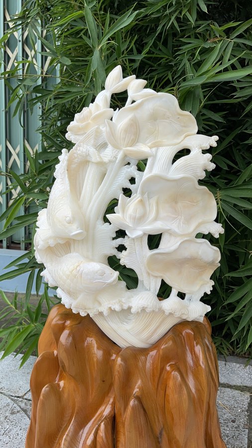 + Nguồn gốc: Tác phẩm được điêu khắc trên vỏ sò hóa thạch khủng trên 1 mét ,có niên đại hàng nghìn năm tuổi .