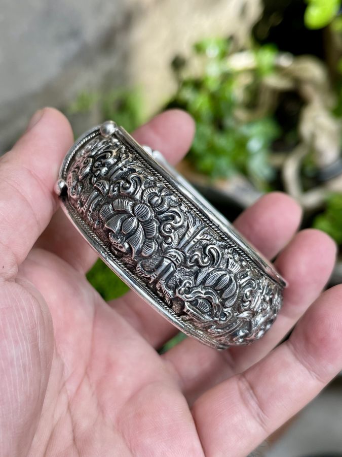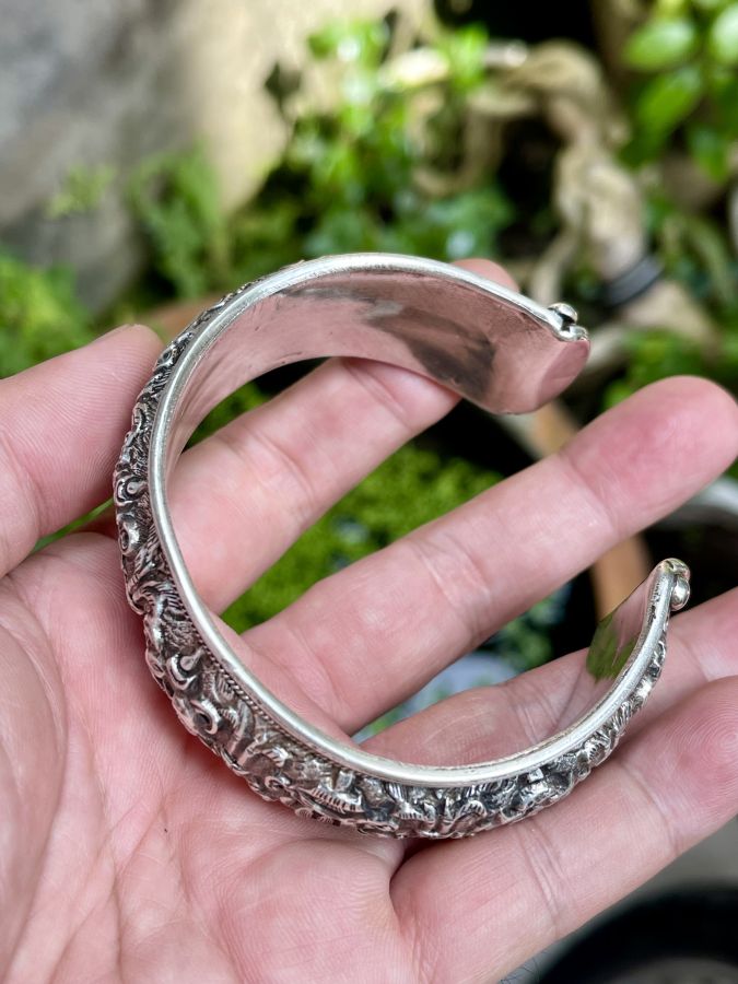 Vòng kiềng chữ C bạc xưa chạm hoa văn rất khéo đẹp Chữ C free size tay to nhỏ vô ra thoải mái Nặng 1,41 lượng , size 6,4cm , bản 2,5cm