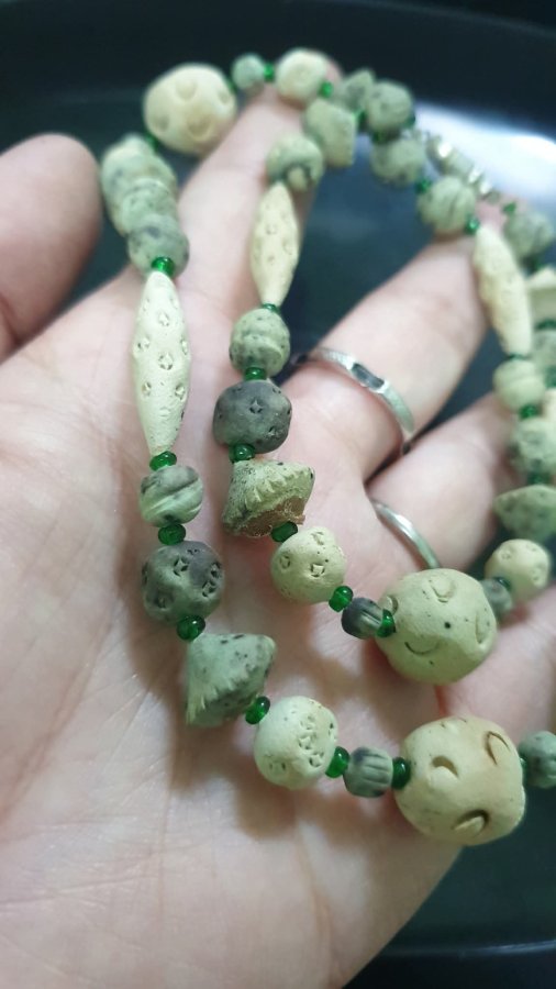 Mẫu này em xỏ lại phối với các hạt cườm xanh của Nhật tạo độ nhấn cho sản phẩm. Dù không biết là có niên đại lâu năm hay không thì cũng rất đáng để sưu tầm như 1 món hàng độc lạ 🥰