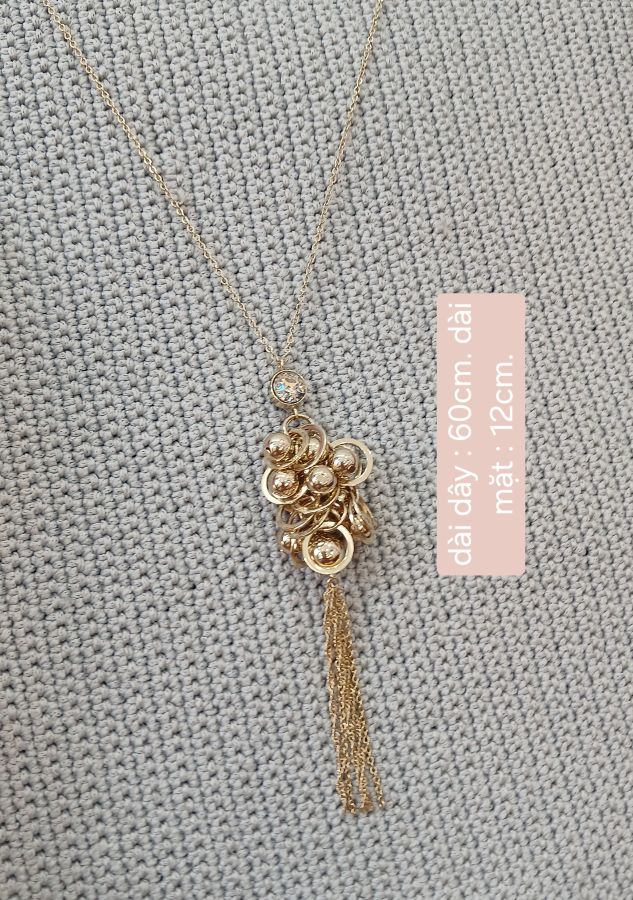 🌈 🌈 🌈 Nước vàng màu đẹp chứ ko vàng chóe như hàng Quảng đâu ạ. Dài dây : 60cm, tròng đầu vừa, mặt là chùm châu đính 1 viên đá trắng lấp lánh, có chùm tua rua như hình, mix áo dài, đầm, bao hợp.
