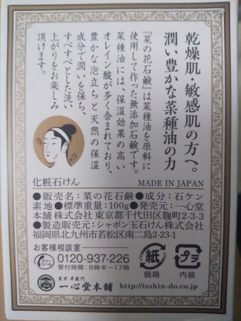 ●Thương hiệu: Nanohana Soap ●Thành phần: xà phòng cơ bản ●Trọng lượng tiêu chuẩn: 100g ●Bán bởi: Isshindo Honpo Co., Ltd. 2-3-3 Kojimachi, Chiyoda-ku, Tokyo Cơ quan sản xuất và bán hàng: Shabondama Soap Co., Ltd.