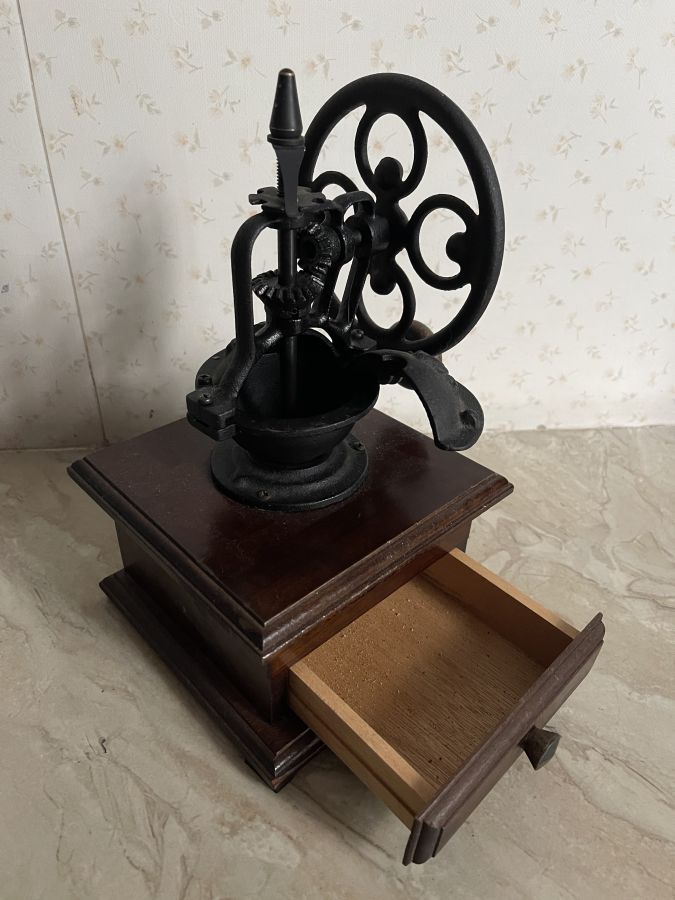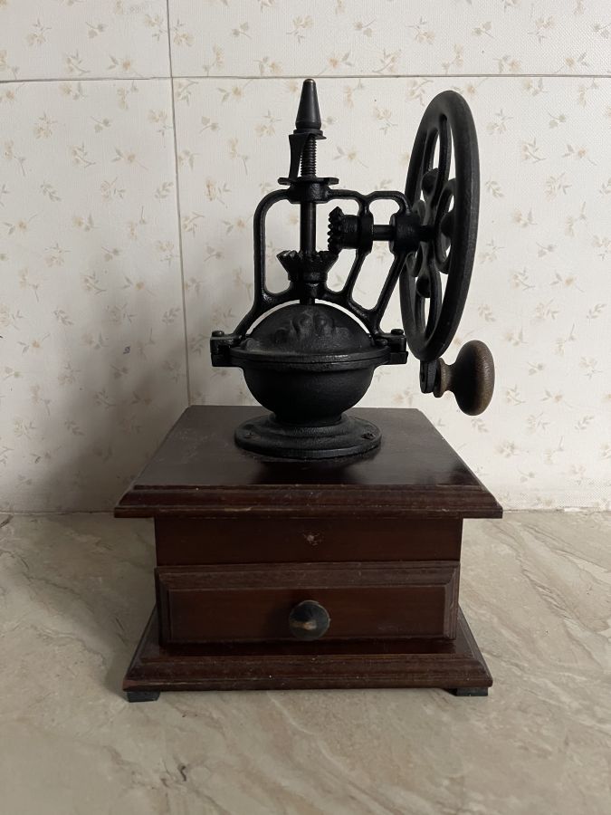 Cối xay cafe xưa quay bằng tay thủ công , bằng gang đúc ,răng cốt thép , thùng gỗ , sử dụng ngon lành , xay tiêu và xay đc tất cả các loại hạt Cao 28cm