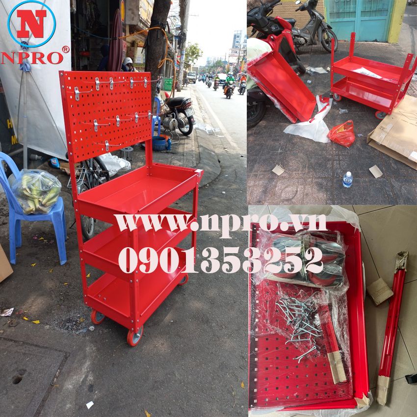 Xe đẩy 3 ngăn giá treo dụng cụ hay còn gọi kệ để đồ nghề, xe đẩy đồ nghề có bánh xe tiện di chuyển. Sản phẩm chuyên dùng đựng dụng cụ cơ khí trong các xưởng cơ khí, xí nghiệp hay đựng đồ nghề trong cửa hàng sửa chữa xe máy, gara ô tô , head và giả head Honda, Yammaha, Piaggio hoặc thiết bị trong các hộ gia đình.