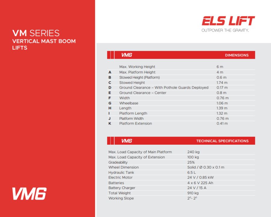 Xe nâng người thẳng đứng ELS VM6 đến từ thương hiệu ELS là lựa chọn tối ưu cho các công việc có yêu cầu độ cao vừa phải. Với thiết kế gọn nhẹ, dễ sử dụng, và hệ thống kiểm soát hiện đại, VM6 phù hợp cho nhiều lĩnh vực như xây dựng, bảo trì, vệ sinh công nghiệp và nhiều ứng dụng khác. Điểm nổi bật của VM6 là khả năng vận hành thân thiện với môi trường nhờ hệ thống pin không phát thải, đồng thời chi phí bảo trì thấp và dễ dàng điều khiển.