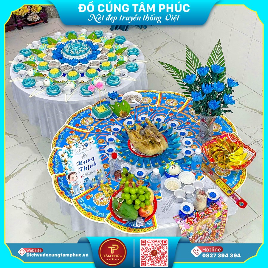 Xanh dương tượng trưng cho sự bình yên, thông minh và sáng suốt. Mâm cúng xanh dương mang ý nghĩa mong bé có tâm hồn đẹp, trí tuệ sáng, tương lai vững vàng.