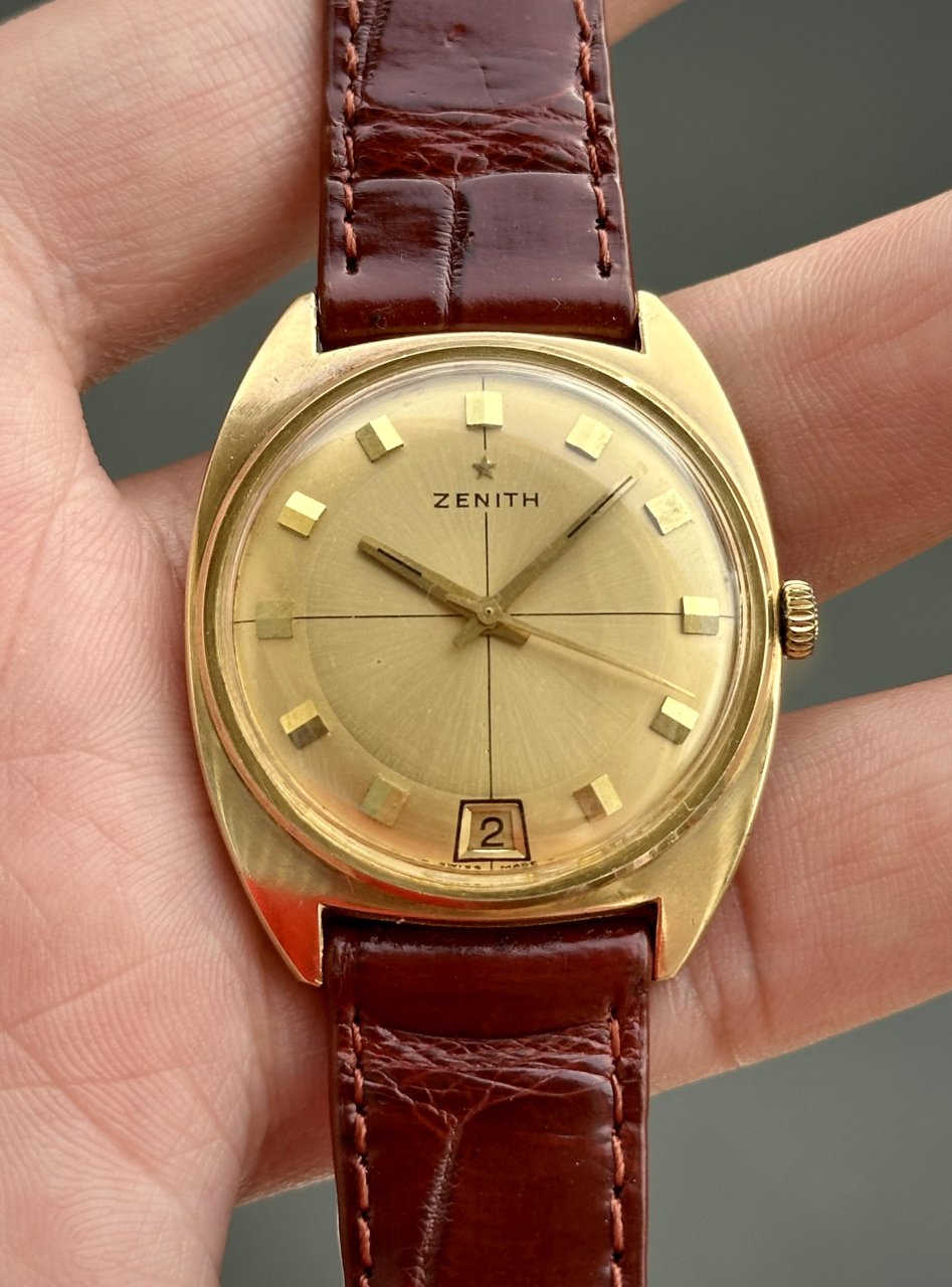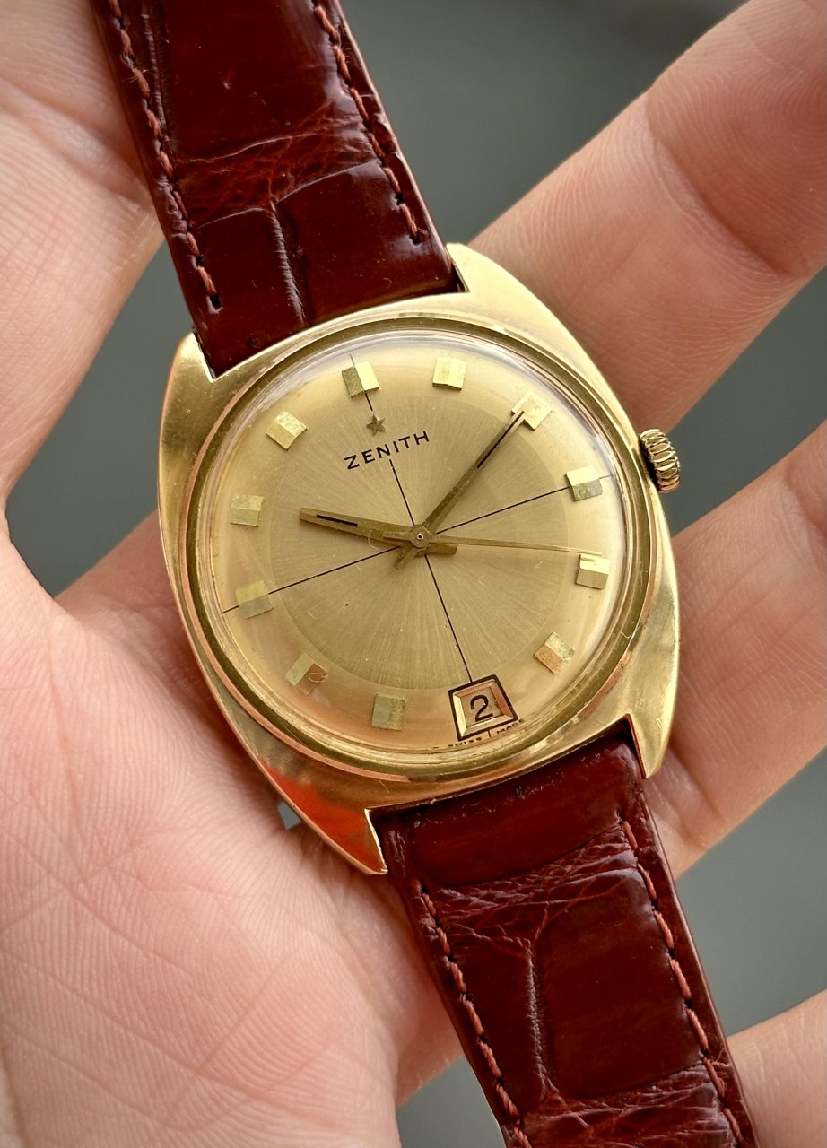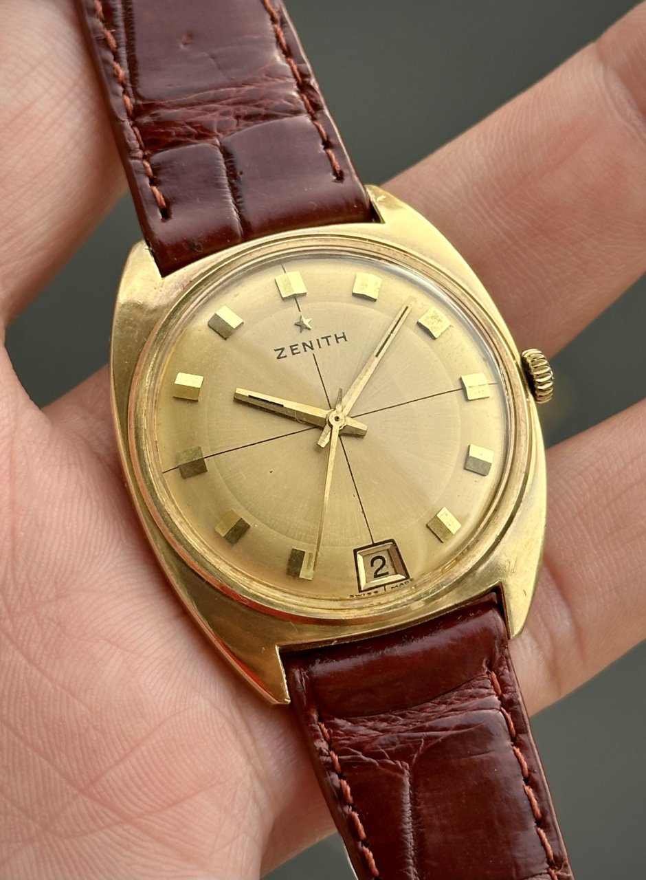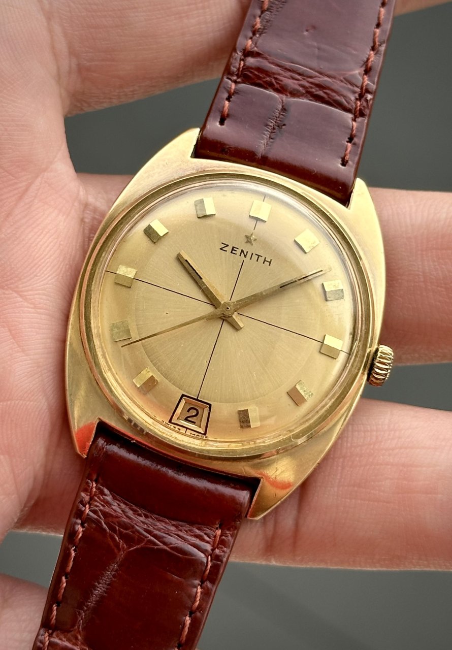 🔸Dial 2 Tone vàng gold chải tia lên màu Patina theo thời gian mang đậm chất Vintage, trục tung hoành,lịch Lộc vị trí 6h hiếm gặp.Logo thượng ngôi sao Zenith,Kim cọc số nổi đôi bắt sáng rất tốt.Dây da ngoại,khoá xưa bọc vàng theo dh.