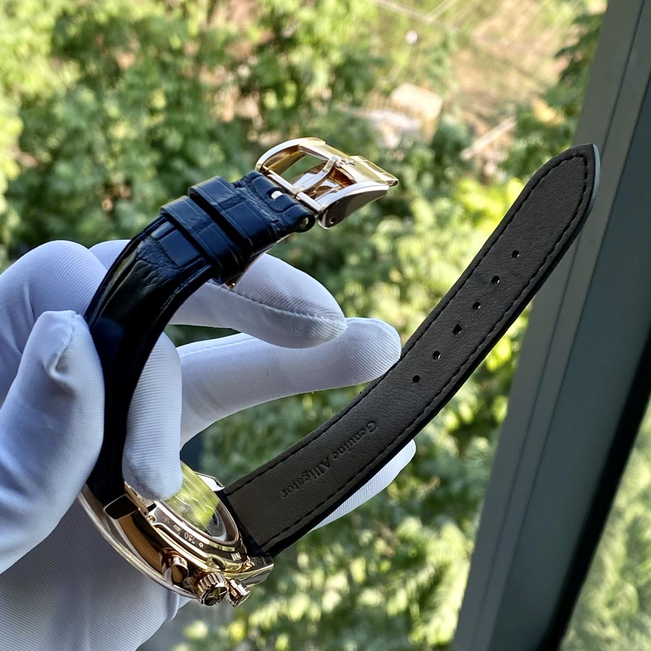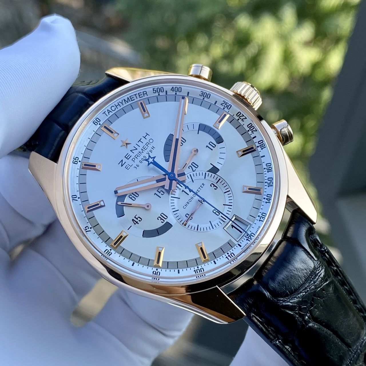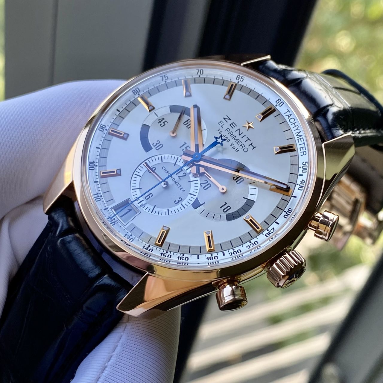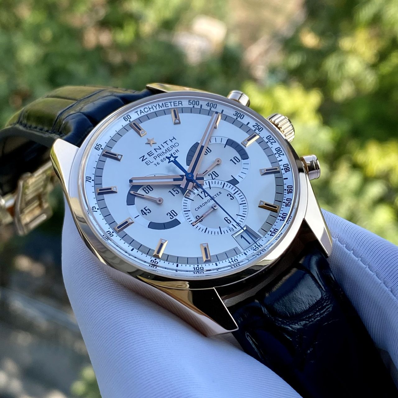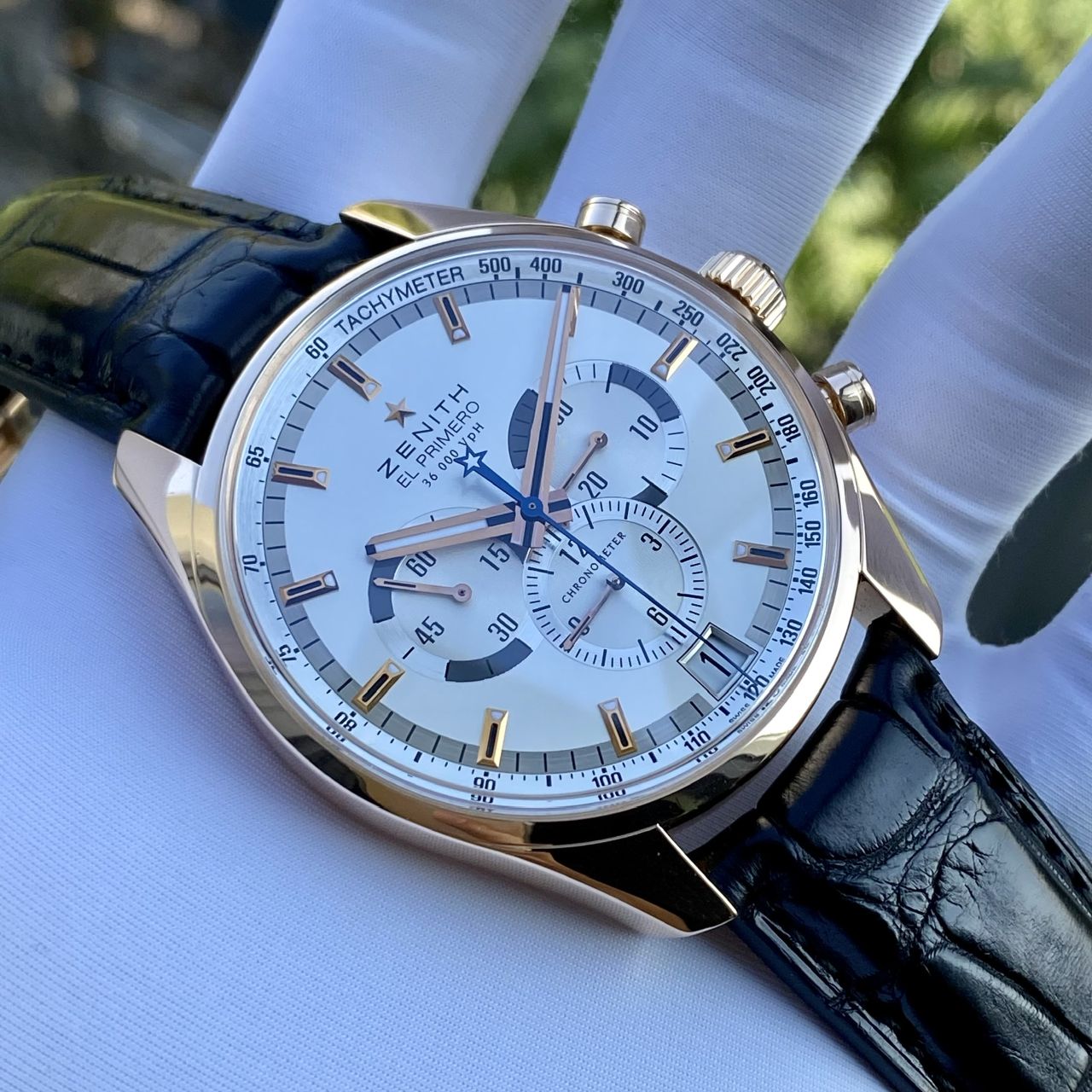 • Model cực hiếm và sang trọng nhà Zenith, cực đầm nặng vàng hồng 18k, dial màu trắng sứ, toàn bộ kim cọc núm bằng vằng hồng 18k